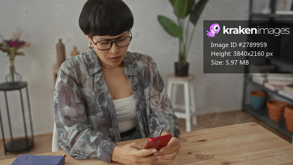 Young chinese woman in glasses sits thoughtfully at a wooden table in a cozy living room, surrounded by indoor plants and books, holding a red phone in a relaxed home setting. - Kraken Images