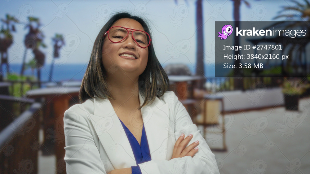 Young chinese woman in glasses and white jacket stands confidently on an outdoor terrace of a city restaurant with palm trees and ocean view in the background. - Kraken Images
