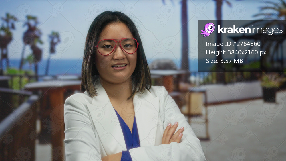Young chinese woman in glasses and white jacket stands confidently on an outdoor terrace of a city restaurant with palm trees and ocean view in the background. - Kraken Images
