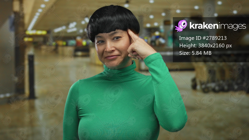 Young chinese woman in green shirt gestures thoughtfully indoors at a busy airport, conveying a sense of intelligence and contemplation.