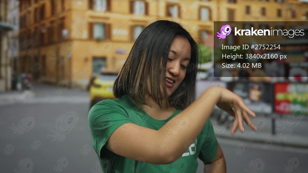 Young chinese woman in green volunteer t-shirt smiling and gesturing energetically on a bustling city street with vibrant buildings and blurred passersby in the background. - Kraken Images