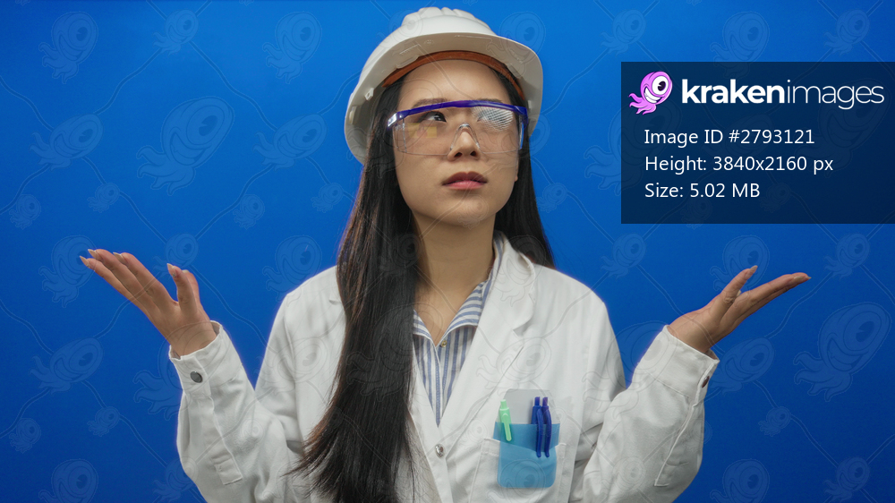 Young chinese woman in hardhat and lab coat raises hands in question against isolated blue background, illustrating confusion or inquiry.