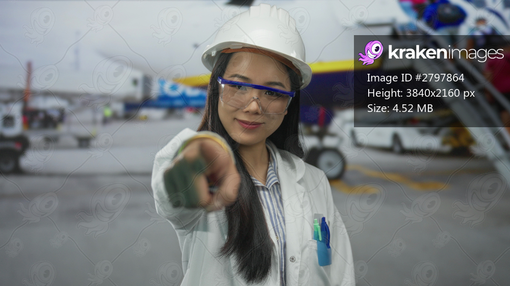 Young chinese woman in hardhat and safety glasses pointing with confidence outside an airport terminal near an airplane emphasizing aviation and safety. - Kraken Images