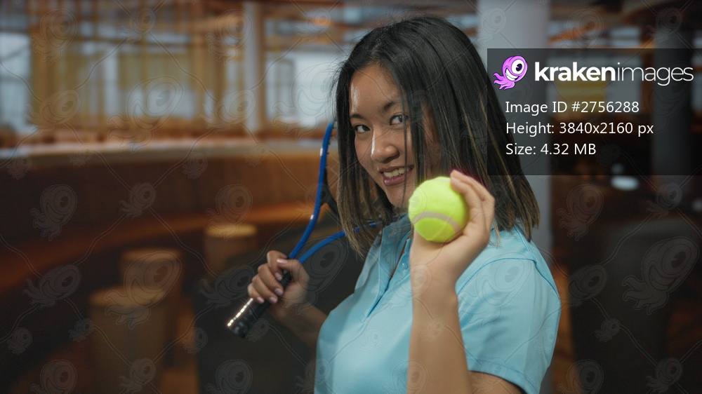 Young chinese woman in hotel room holding tennis racket indoor with smile, dressed in blue, showing tennis ball, suggesting sporty leisure activity in urban setting. - Kraken Images