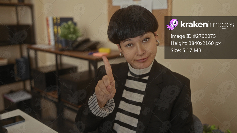 Young chinese woman in office indicates no with finger in a professional setting, surrounded by shelves and a desk, expressing disapproval indoors.