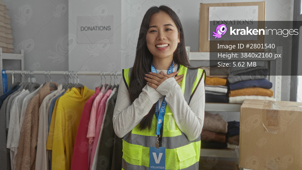 Young chinese woman in reflective vest volunteering in an indoor charity center surrounded by donated clothes for community service.