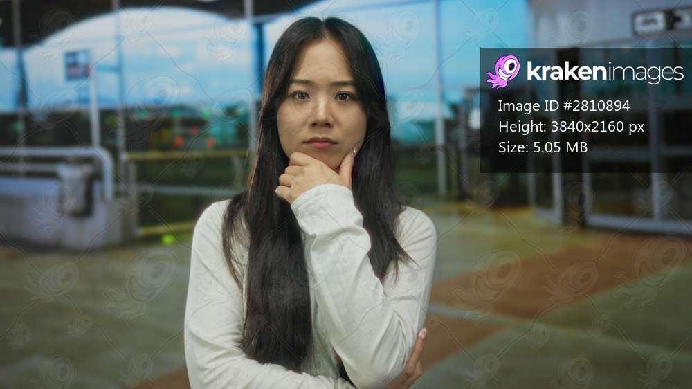 Young chinese woman in white shirt extends hands outdoors at airport terminal contemplating travel destination options.