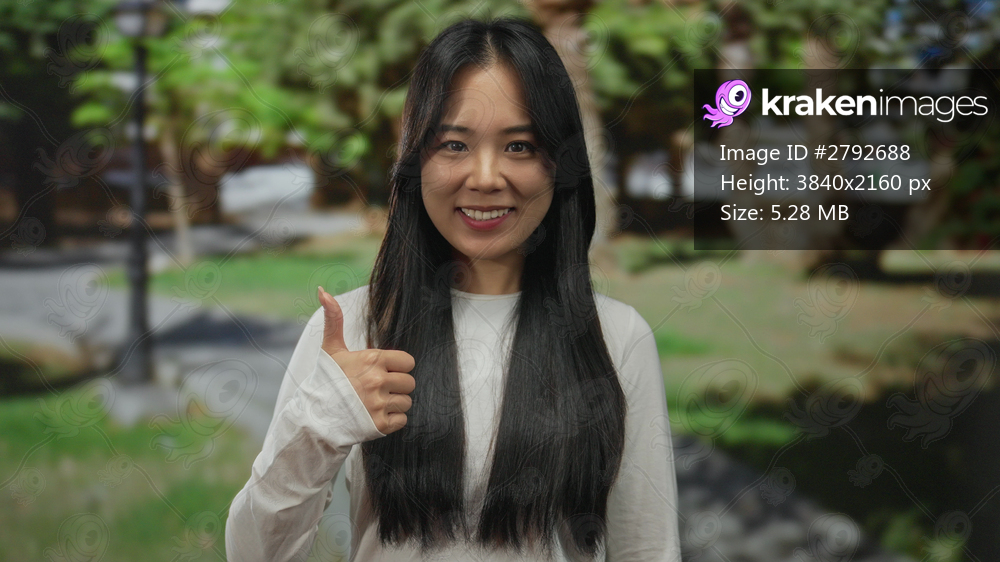 Young chinese woman in white sweater making gesture in sunlit green park, surrounded by lush trees and grass, expressing positivity and engagement outdoors. - Kraken Images