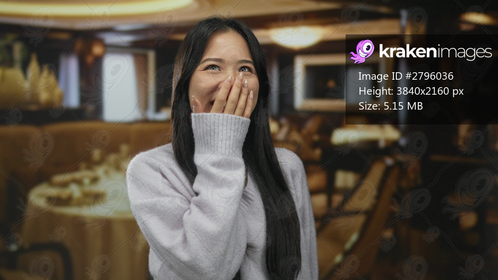 Young chinese woman laughing indoors at a restaurant, dressed in a cozy sweater, creating a warm and joyful atmosphere with elegant dining decor in the background. - Kraken Images