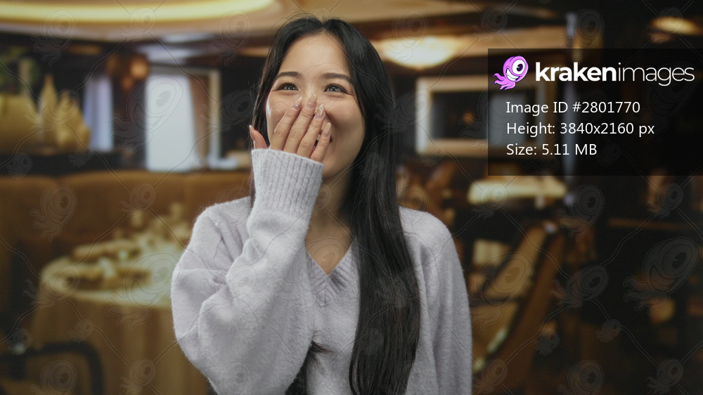 Young chinese woman laughing indoors at a restaurant, dressed in a cozy sweater, creating a warm and joyful atmosphere with elegant dining decor in the background. - Kraken Images