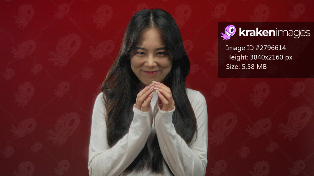 Young chinese woman with long hair smiling thoughtfully against a vivid red wall expressing joy and positivity in an isolated indoor setting.