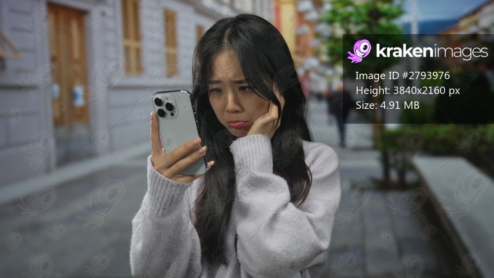 Young chinese woman looking at smartphone with puzzled expression on a city street outdoors, suggesting confusion or concern in urban setting.