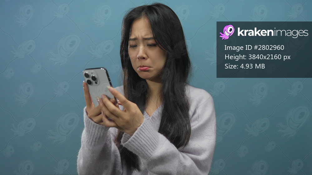 Young chinese woman looking concerned at smartphone over isolated blue background, conveying emotion and digital interaction.