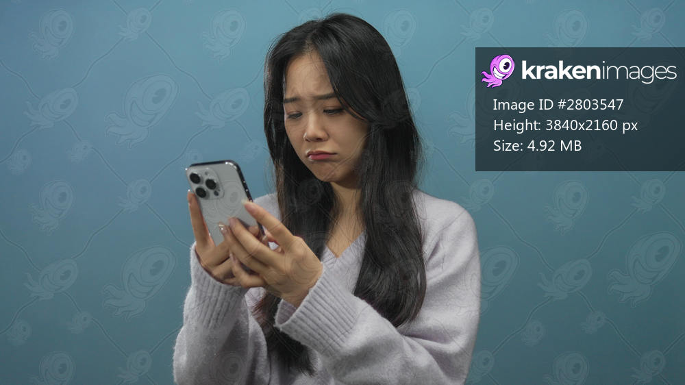 Young chinese woman looking concerned at smartphone over isolated blue background, conveying emotion and digital interaction.