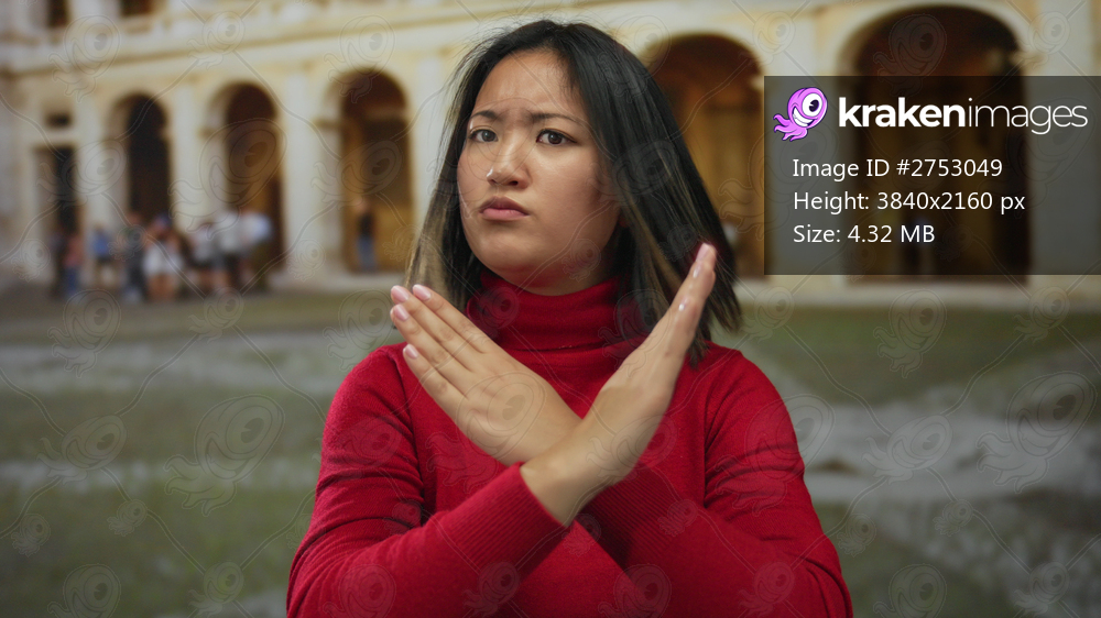 Young chinese woman making an x gesture with crossed arms in an outdoor university setting, wearing a red sweater, expressing dissatisfaction at an old architectural background. - Kraken Images
