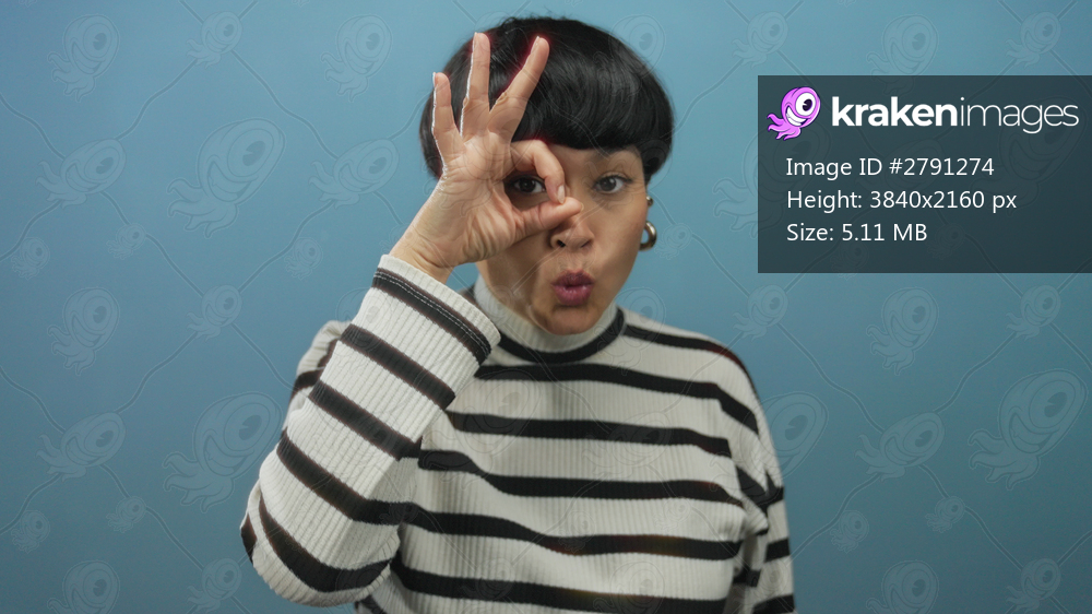 Young chinese woman making okay gesture over isolated blue background in a striped outfit playfully engages with the camera creating a fun and light-hearted mood. - Kraken Images