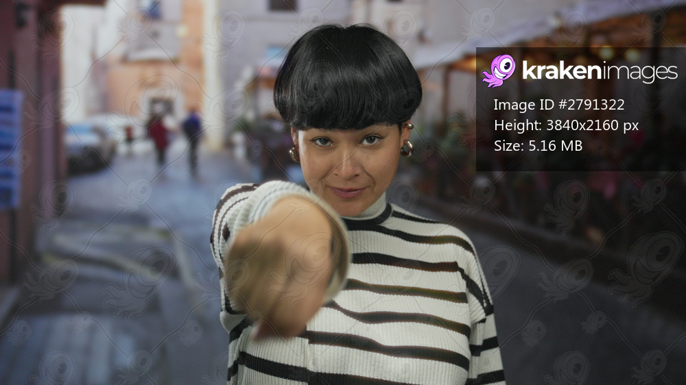 Young chinese woman on restaurant terrace making a brotherhood gesture with her fist on chest, wearing striped sweater outdoors.