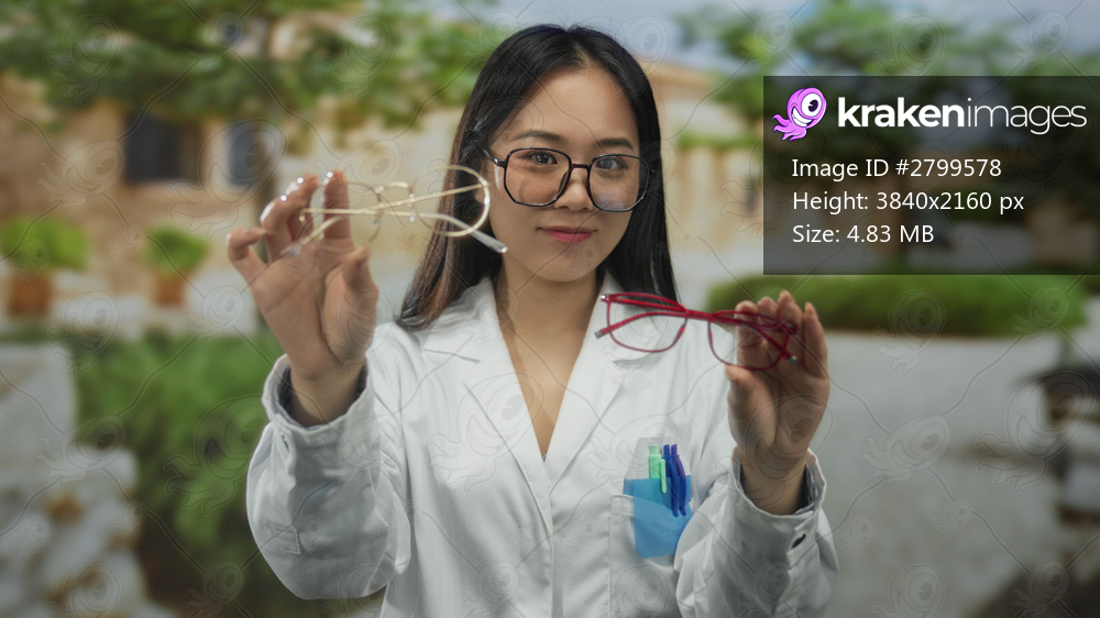 Young chinese woman optician in uniform holding eyeglasses outdoors on the street examining frames with a focused expression against a leafy blurred background. - Kraken Images