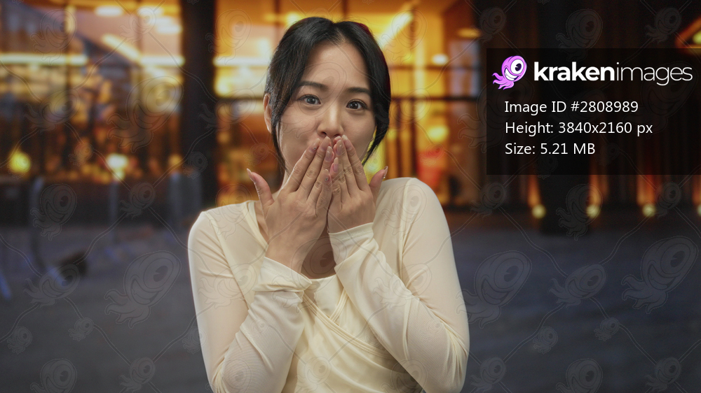 Young chinese woman outdoors blowing a kiss to the camera at night with colorful lights in the background, expressing happiness and connection.