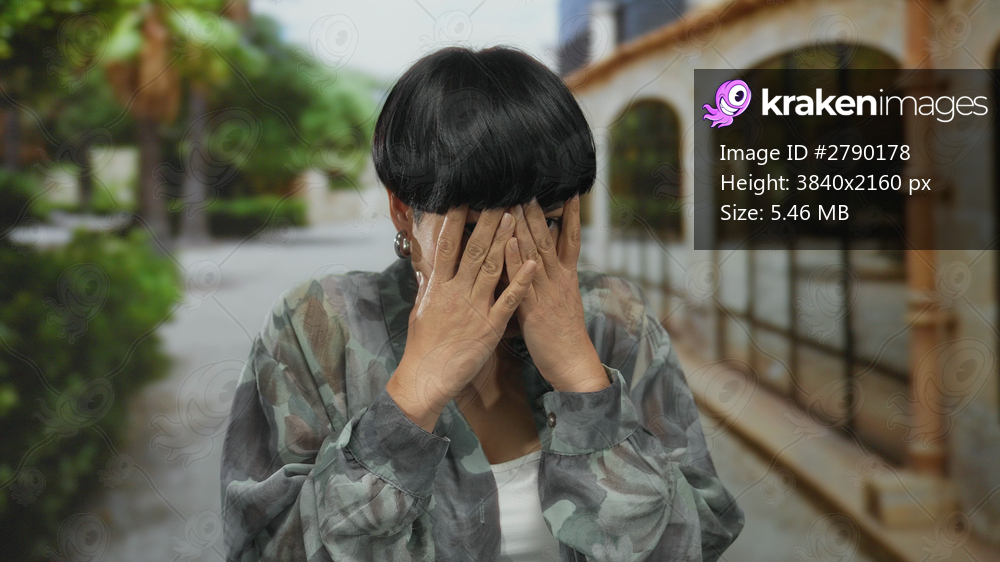 Young chinese woman outdoors covering face in fear on a sunny day, surrounded by greenery and architecture, conveying strong emotion and vulnerability. - Kraken Images