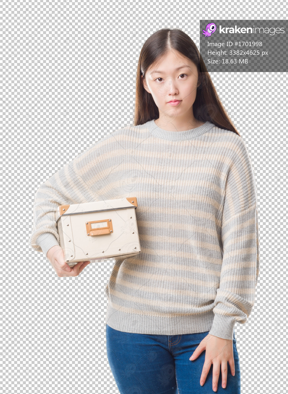 Young Chinese woman over isolated background holding a box with a confident expression on smart face thinking serious