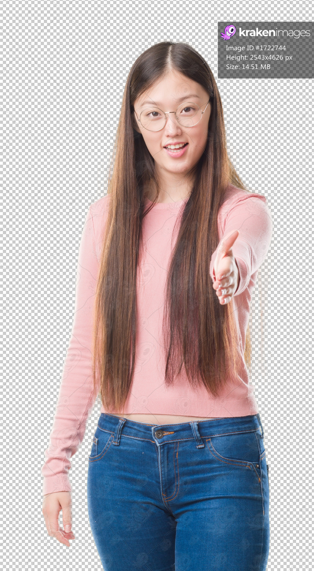 Young Chinese woman over isolated background wearing glasses smiling friendly offering handshake as greeting and welcoming. Successful business.