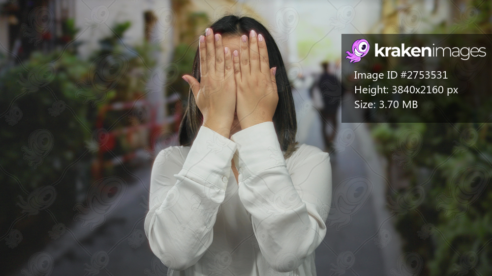 Young chinese woman playfully reveals her face, smiling on a lively street surrounded by urban vegetation in a bustling city setting, creating a joyful and engaging outdoor scene. - Kraken Images