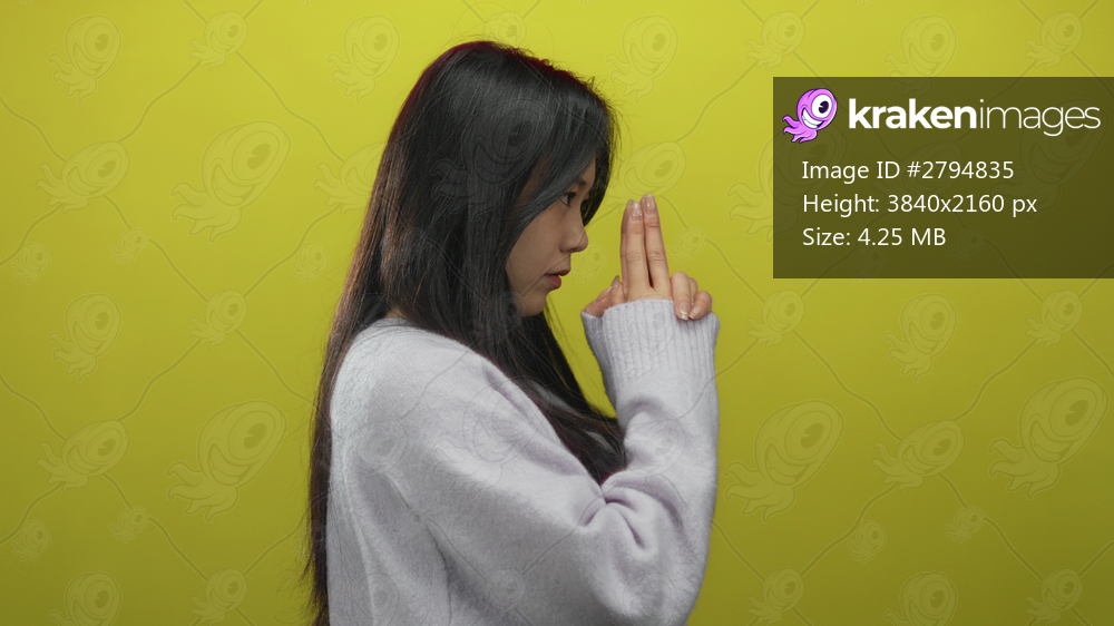 Young chinese woman posing playfully with finger guns against a vibrant yellow background, exuding confidence and style with her long dark hair flowing effortlessly over her shoulders. - Kraken Images