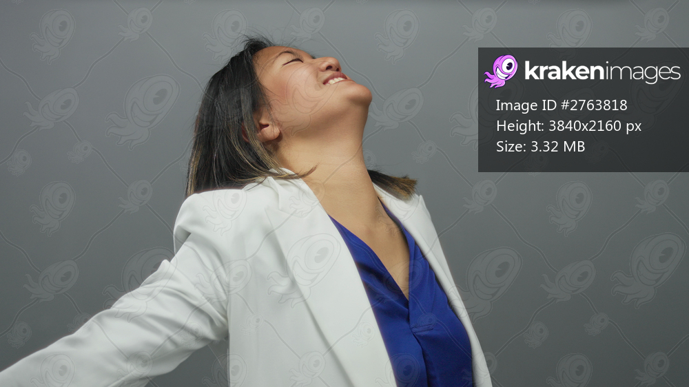 Young chinese woman rejoices with arms outstretched against isolated grey background wearing white jacket and blue shirt.