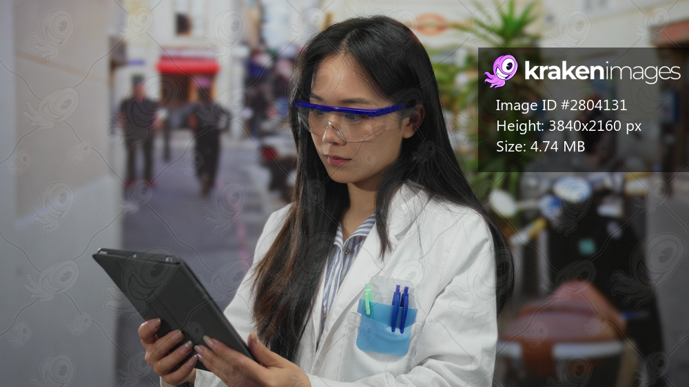 Young chinese woman scientist in a lab coat and protective glasses analyzing data on a tablet outdoors on a bustling street.