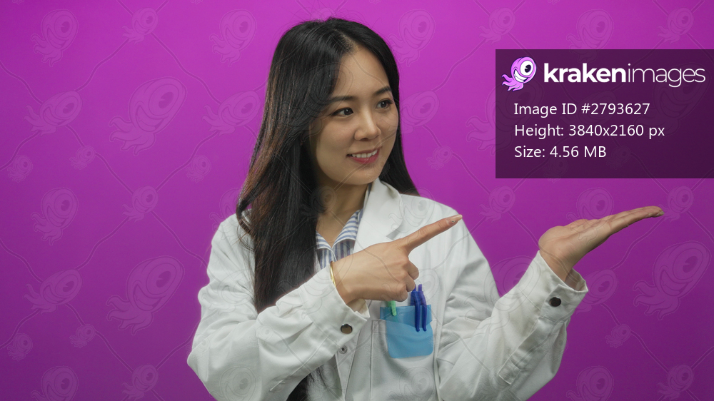 Young chinese woman scientist in uniform presenting with hand over isolated pink background wall.