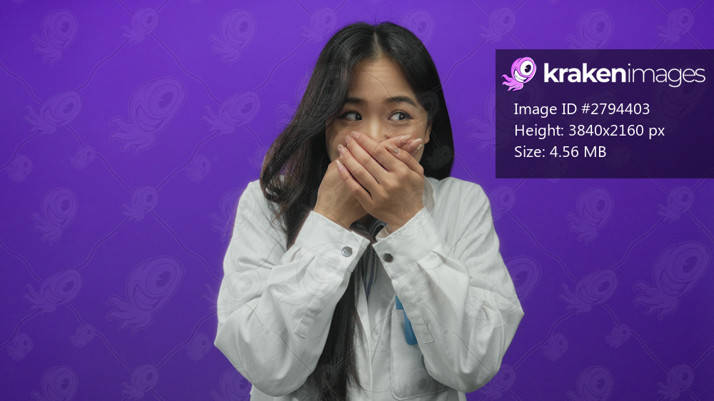 Young chinese woman scientist in white uniform over isolated purple background expressing surprise with hands covering mouth.