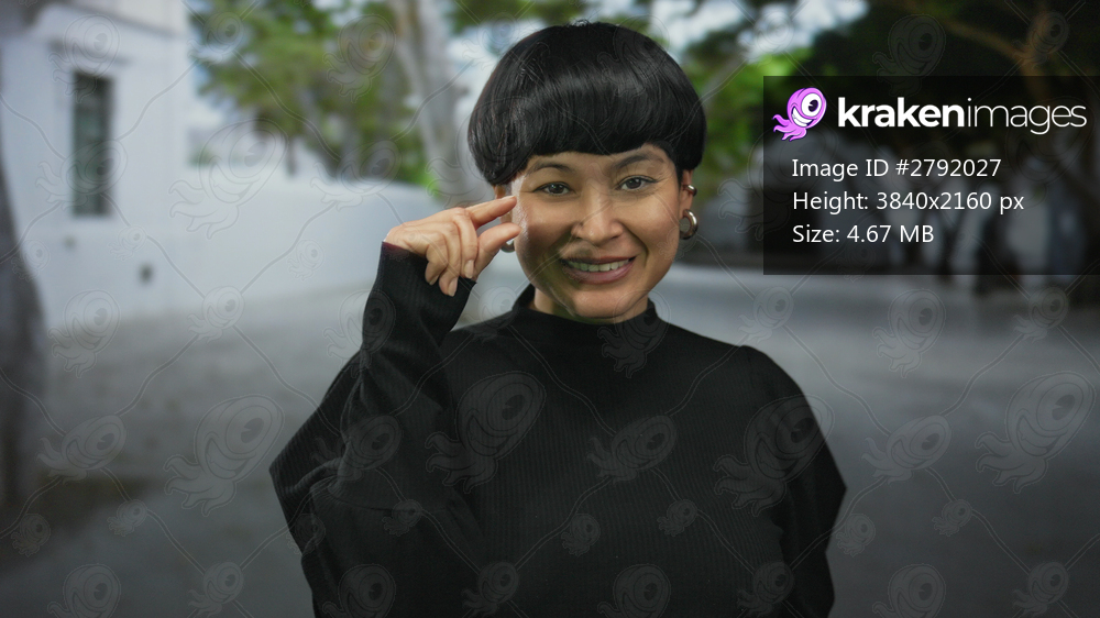 Young chinese woman with short hair gestures playfully showing small size with fingers on a city street, conveying a cheerful outdoor urban scene.