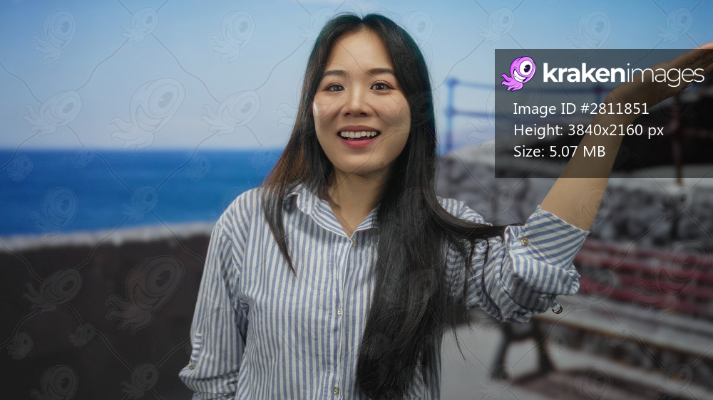 Young chinese woman smiling at the seaside promenade in an outdoor setting with the blue ocean as a backdrop on a sunny day.