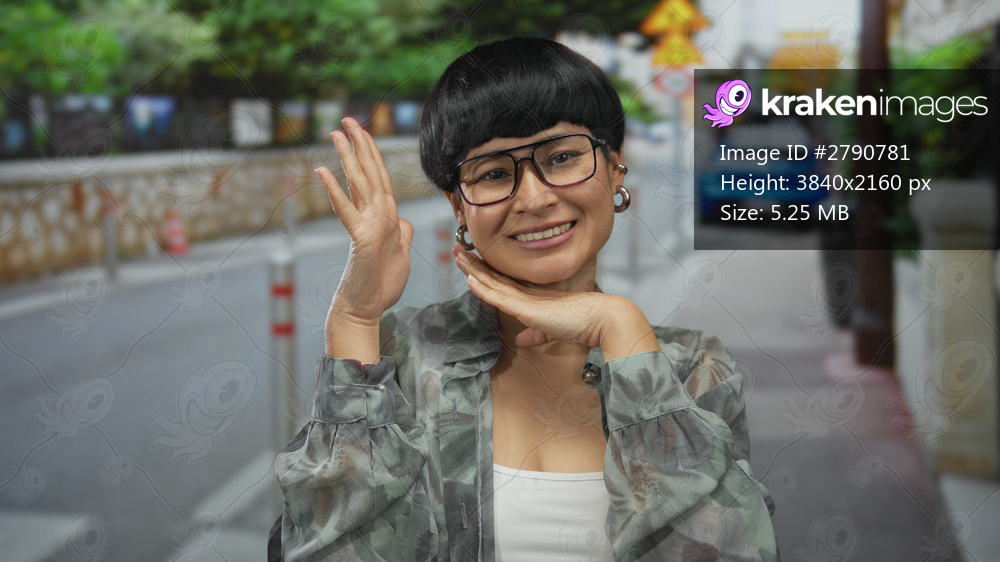 Young chinese woman smiling with glasses poses framing her face with hands on a city street outdoors, surrounded by vibrant urban scenery and traffic.