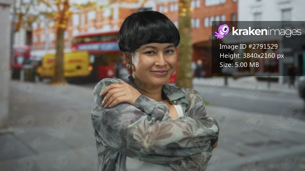 Young chinese woman smiling on a city street embraces herself amid colorful urban background featuring buses and buildings.