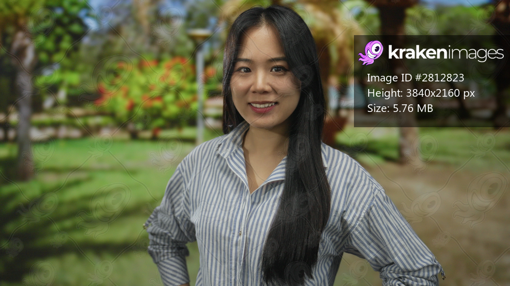 Young chinese woman smiling outdoors in a vibrant green park setting with trees and flowers in the background, exuding a sense of joy and tranquility.