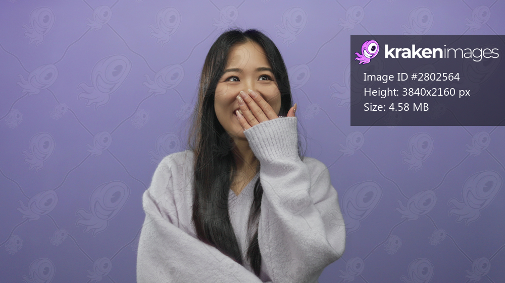 Young chinese woman smiling playfully over isolated purple background, conveying a sense of joy with long black hair and light gray sweater.