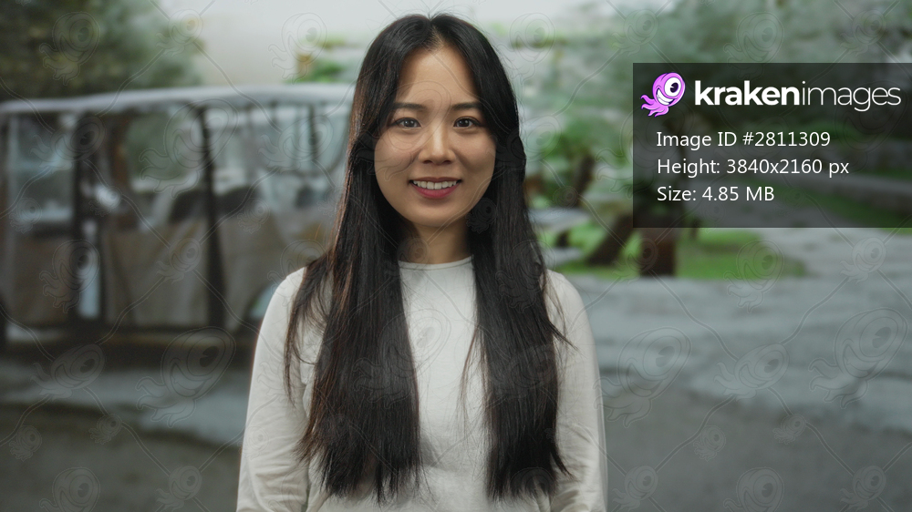 Young chinese woman smiling and saluting in a green park setting with trees and paved path, wearing casual white top outdoors with blurred background.