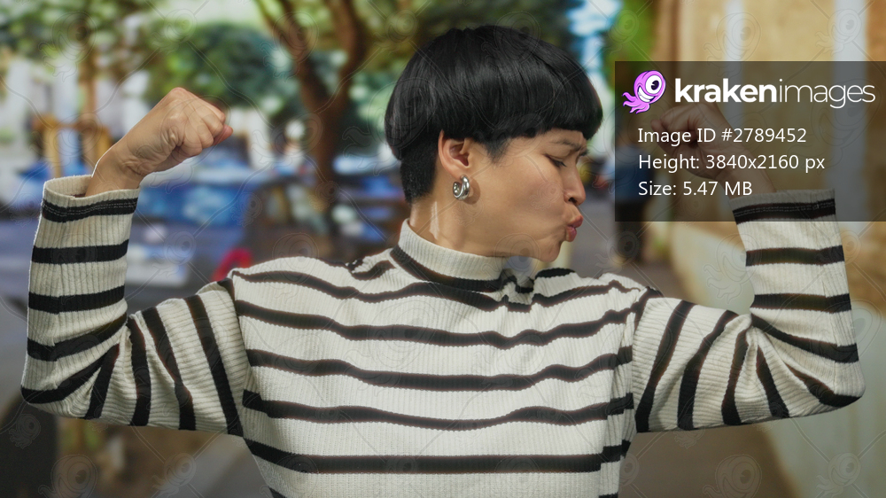 Young chinese woman standing confidently on a bustling city street during daytime, showing determination and strength with trees and cars in the background. - Kraken Images