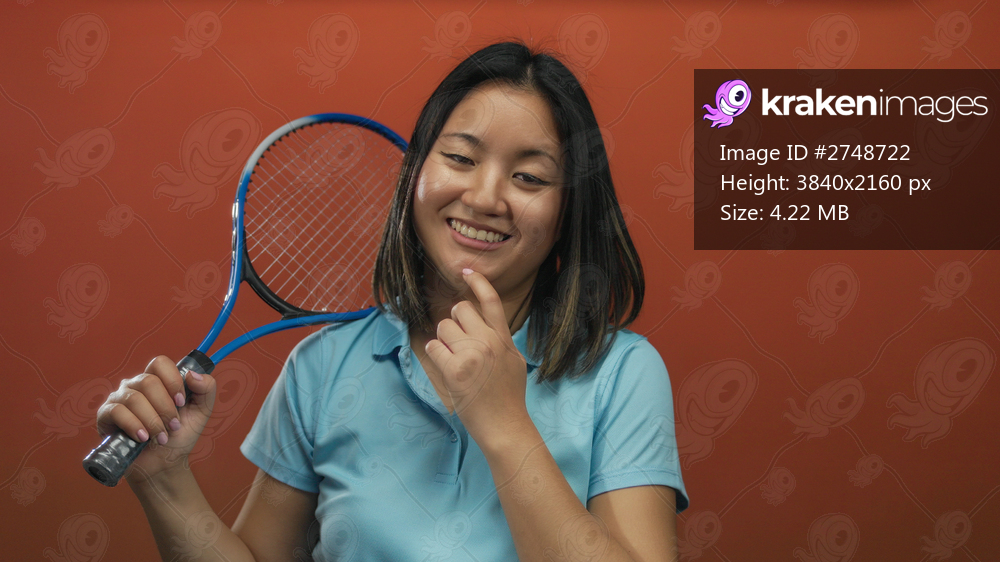 Young chinese woman with tennis racket poses against isolated red background wall, smiling and thoughtful.