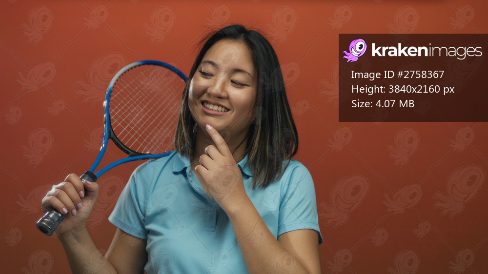Young chinese woman with tennis racket poses against isolated red background wall, smiling and thoughtful.