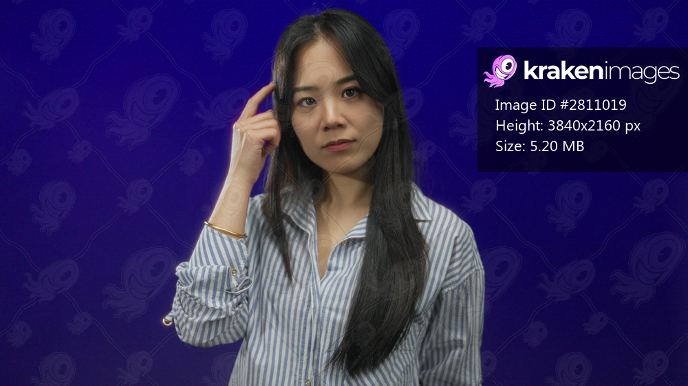 Young chinese woman touches her head and points to the camera against a vibrant blue background, suggesting thought or idea.