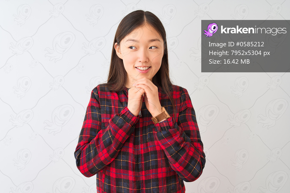 Young chinese woman wearing casual jacket standing over isolated white background laughing nervous and excited with hands on chin looking to the side