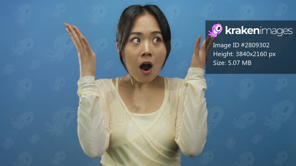 Young chinese woman wearing cream top expresses surprise with hands raised against isolated blue background wall.