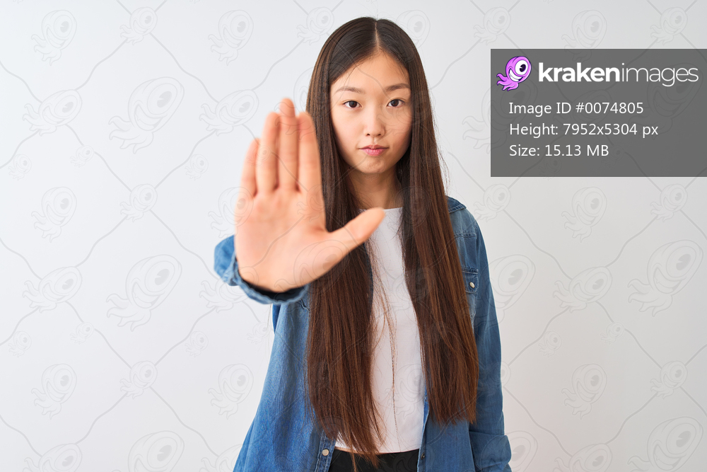 Young chinese woman wearing denim shirt standing over isolated white background doing stop sing with palm of the hand. Warning expression with negative and serious gesture on the face. - Kraken Images