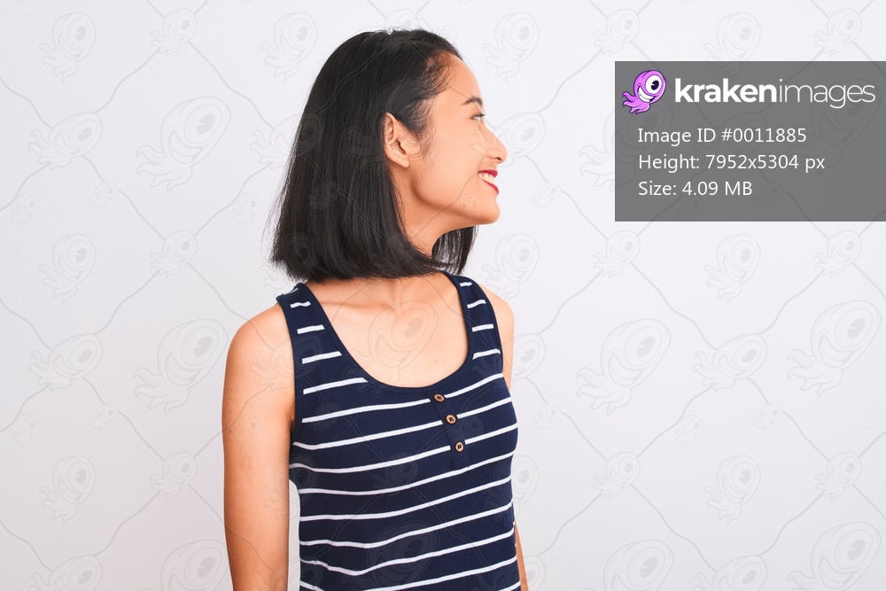 Young chinese woman wearing striped t-shirt standing over isolated white background looking to side, relax profile pose with natural face with confident smile. - Kraken Images