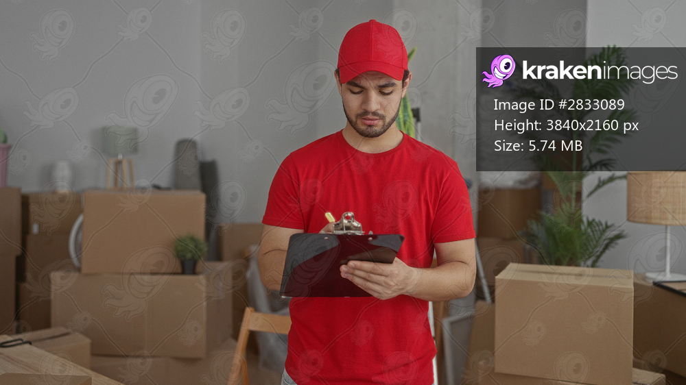 Young courier man holding clipboard checking delivered boxes in a building interior room; duty reliability.