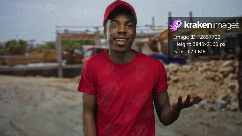 Young courier man smiling holds hand palm up at construction site in red shirt and cap; confidence.