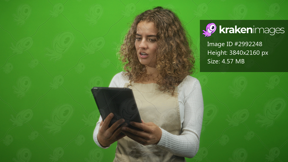 Young curly hair woman in apron holding tablet with furrowed brow and visible hands in studio greenscreen; confusion troubleshooting.